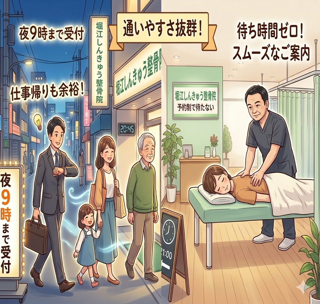事故後の通院は継続が大切です。当院では患者様をお待たせしないよう「予約優先制」を導入しております。また、平日は夜9時まで受け付けておりますので、お仕事帰りでも無理なく通院いただけます。