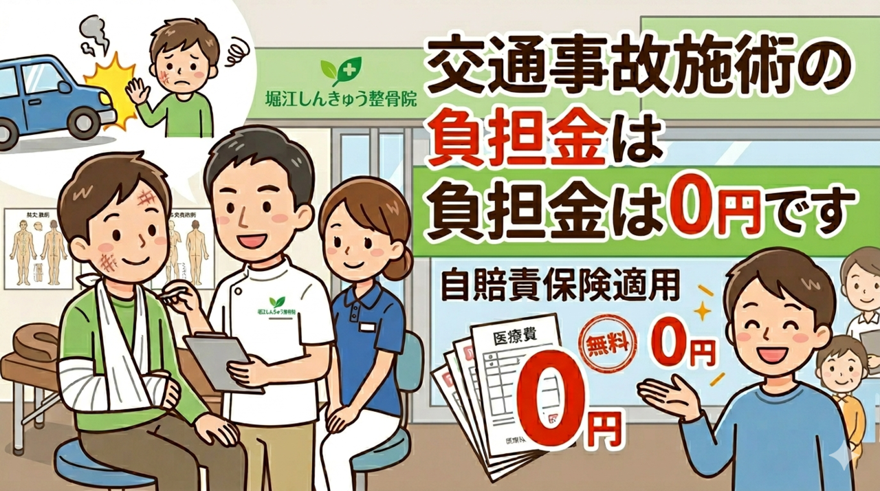 K.F初めて交通事故に遭いどのように対応していいかわからずに困っていました。事故のダメージで体のあちこちが痛くこの痛みがなくなるのか不安でした。堀江しんきゅう整骨院さんにお世話になり治療方針や今の自分の体の状態今後どの様なペースで体が良くなっていくのかわかりやすく説明して頂き不安感が安心にかわりました。治療以外でも交通事故の対応も相談できたので助かりました。